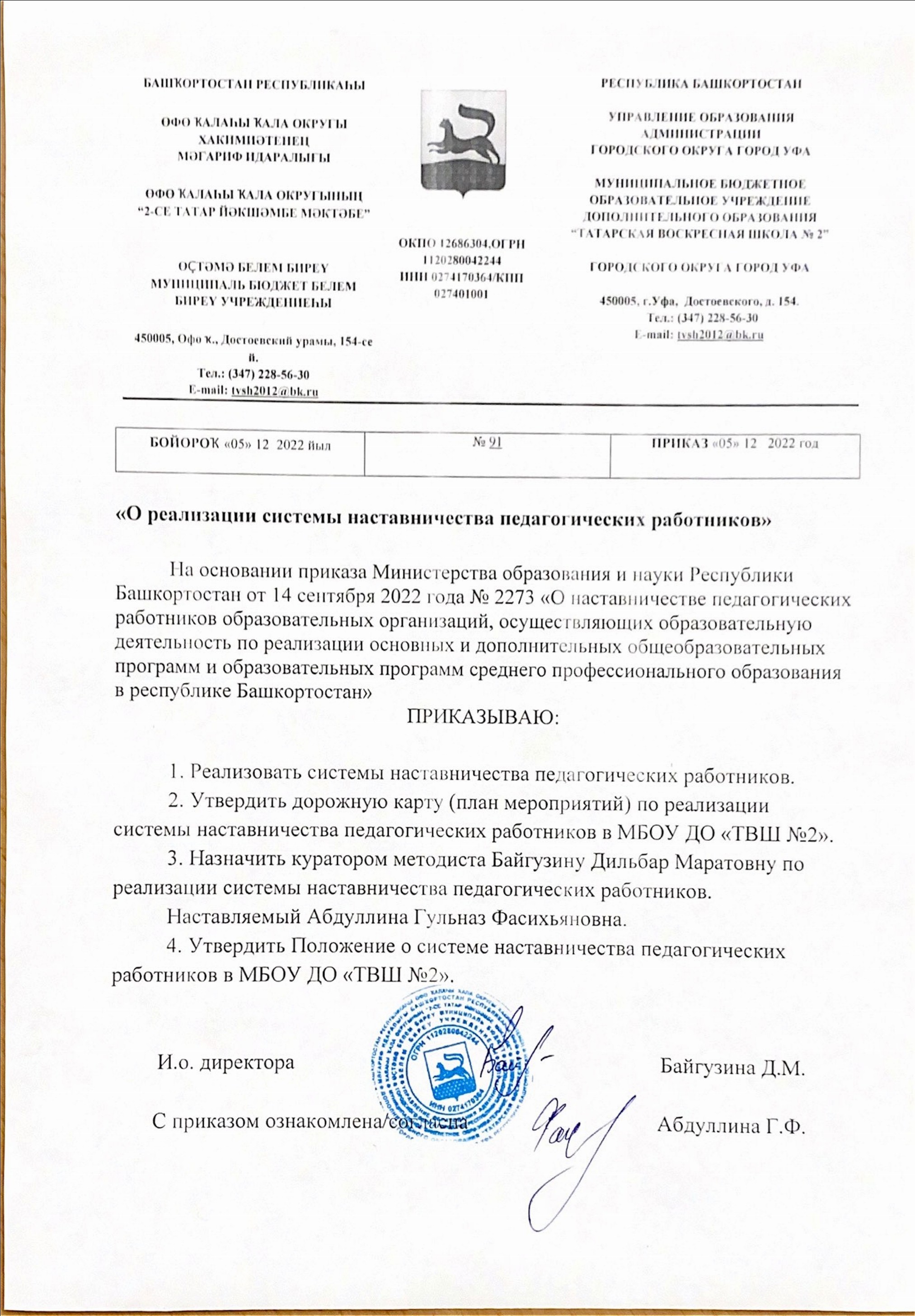 Приказ об организации работы системы наставничества педагогических работников в МБОУ ДО ТВШ №2