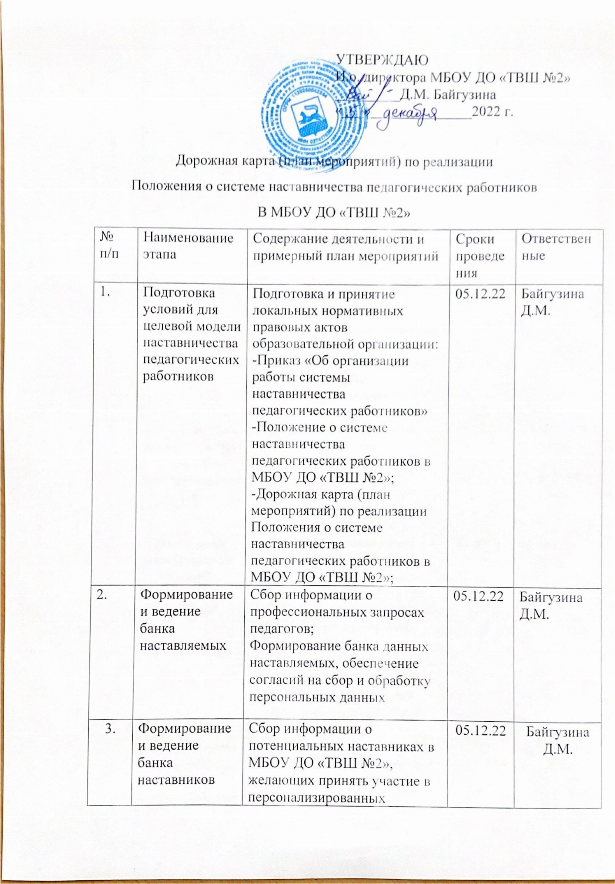 Дорожная карта (план мероприятий) по реализации Положения о системе наставничества педагогических работников в МБОУ ДО ТВШ №2