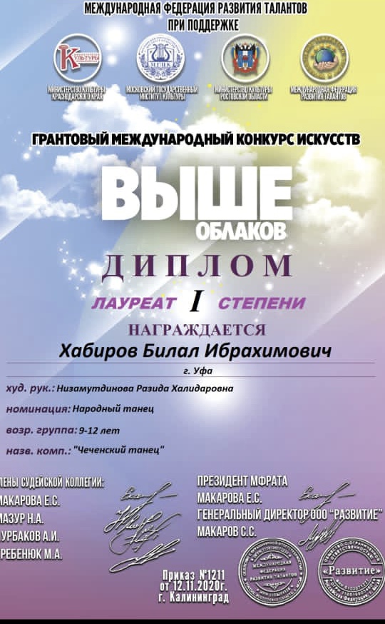 За это время он станцевал танцы различных народов. Особенно запоминающимися стали партии в танцевальных номерах «Балыкчы», «Шаян кызлар». В этом году Билал впервые станцевал свои соло в различных конкурсах и фестивалях. А сегодня его пригласили на передачу «Утро в столице» канала «Вся Уфа», где Билал станцевал под горячие ритмы кавказских мелодий. И сегодня же были объявлены результаты международного конкурса искусств «Выше облаков», где среди 27 участников наш ученик стал лауреатом 1 степени.