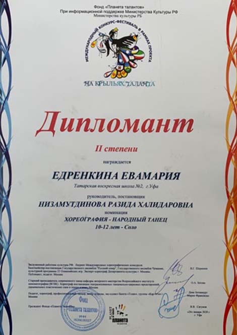 Ученица Татарской воскресной школы №2 г.Уфа Едренкина Ева-Мария выступила с испанским танцем в номинации «Хореография» и стала дипломантом 2 степени.